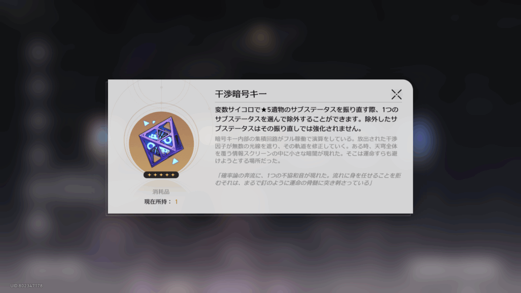 更に新アイテム、干渉暗号キーも報酬に。これは変数サイコロ使用時に強化しないオプションを指定出来るというもの。勿体なくてなかなか使えないやつだ……w