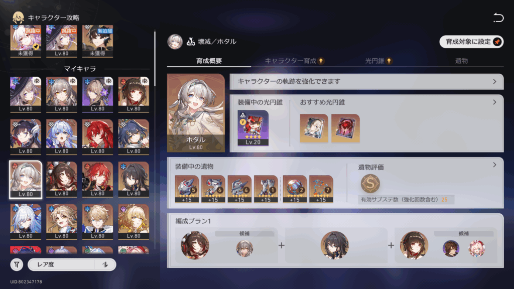 今はキャストリスや長夜月といったHP参照キャラはHP量が優先だろうということで、運命ガン無視で★5光円錐を適当に持たせてるw