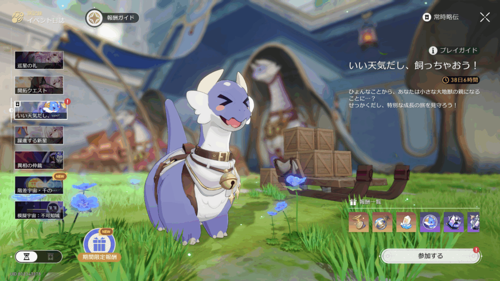 レイシオは唐突に出て来た新キャラが配布って感じだったが、今回はみんな大好き丹恒の最新フォームということで、男性キャラとはいえガチャがめっちゃ回りそうな商材を配布するなんて……。