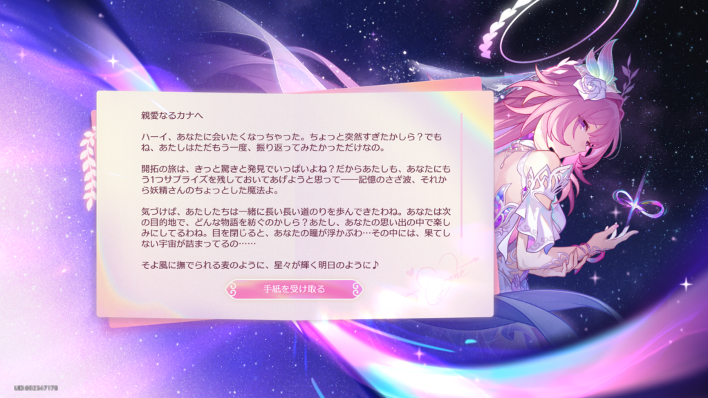 で、ログインしたらしたでキュレネのガチャ宣伝アニメーションは流れるわ、キュレネから手紙が来て、星軌専用チケット10枚配布されるわで。