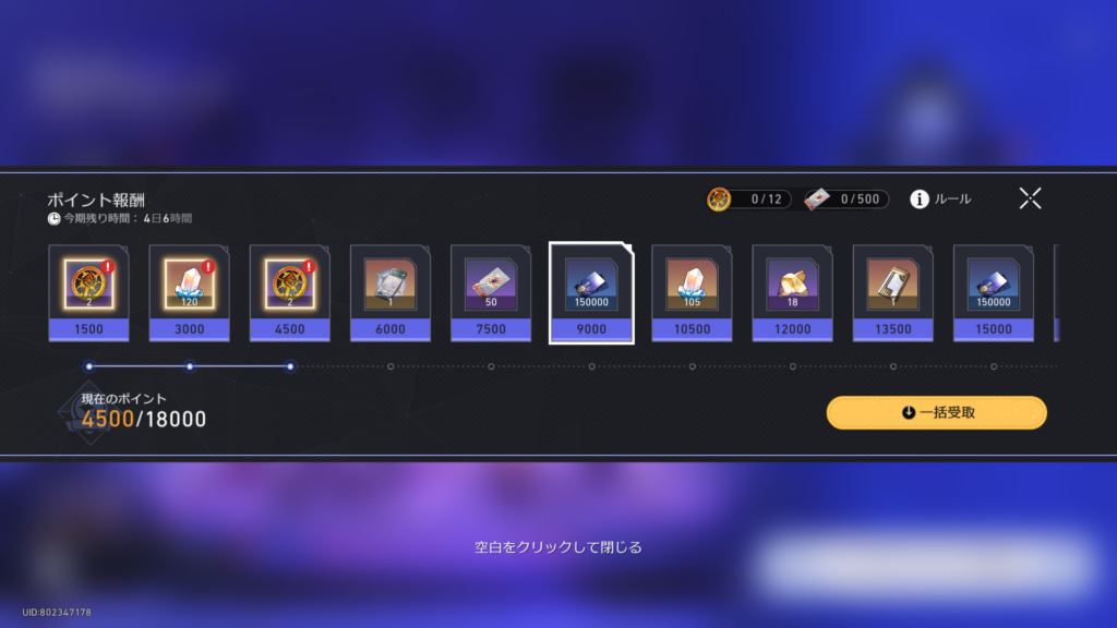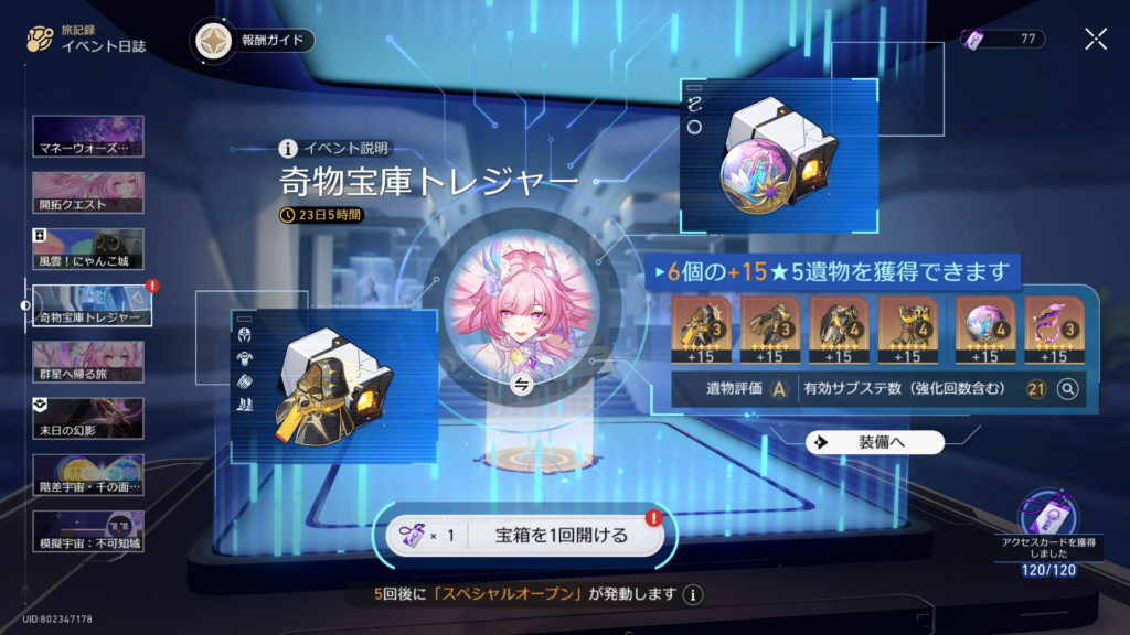 様々なお題をクリアすると貰えるアクセスカードを消費して、あらかじめ指定しておいたキャラの適正遺物をゲットするイベント。