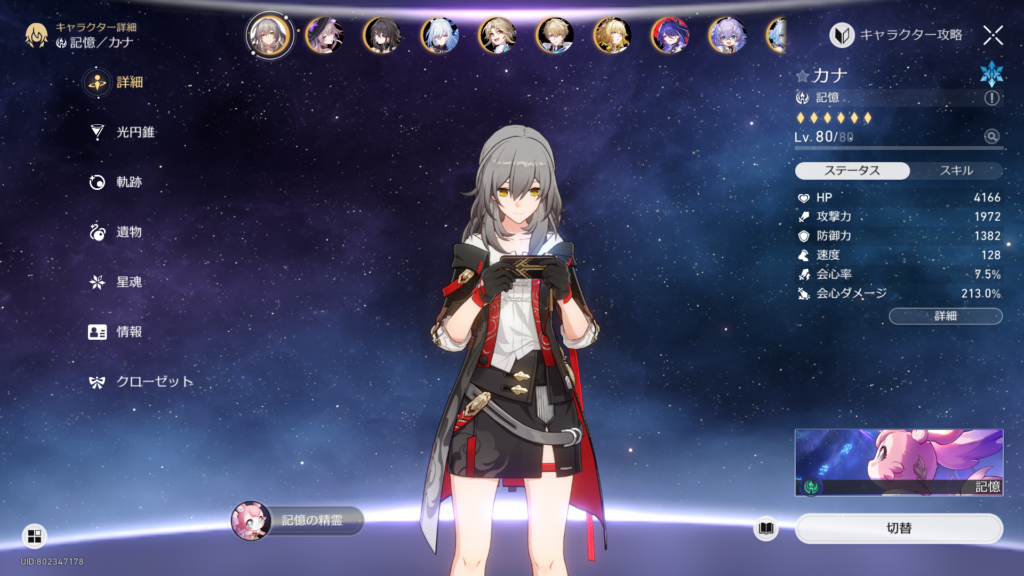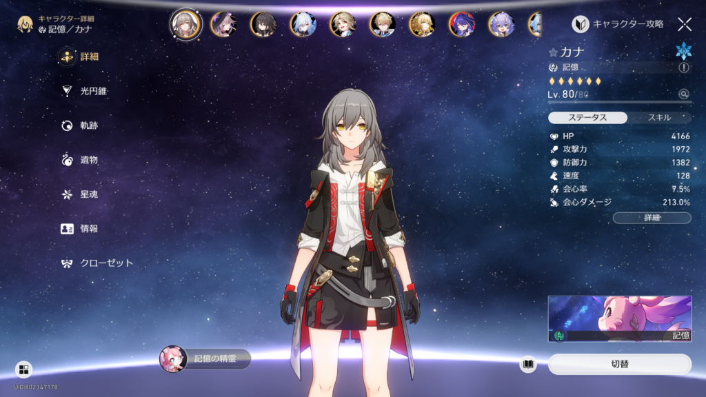 俺が引いてなかったのは景元、カフカ、飲月、アベンチュリンの4名。この中からだとビジュアル的にも性能的にもカフカ一択でしょうってことでカフカを貰いました。これで持続パが超強化されるぞ……!