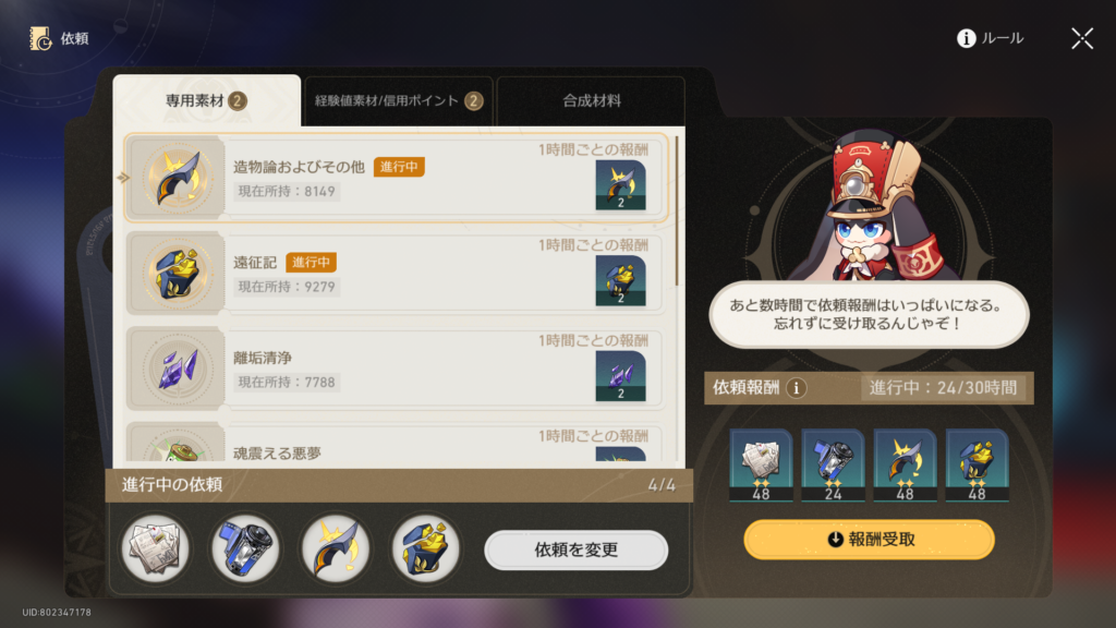 依頼任務、キャラを派遣しなくてよくなったんだな。定期的に成果物を回収するだけOKで、後は集めたい素材を変更したくなるまでは放置でいいのか。徹底的に省力化されとるw