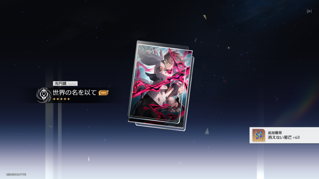 恒常ガチャからヴェルトのモチーフ光円錐が排出。うれぴー!「虚無」キャラに持たせるというより、「記憶」や「愉悦」の穴埋めに使いたいw